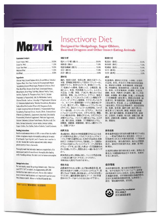 Mazuri食虫動物 ダイエットは、タンパク質・繊維質含量の高い食虫動物の餌を再現するように考えられた飼料です。餌の昆虫のすべてあるいは一部を置き換える飼料として、本製品は幅広い種類の哺乳類、鳥類、爬 虫類および両生類で検証済みです。ミール状の飼料は、獣医師の指示の下適切とみなされる場合には、チュ ーブで強制給餌しても構いません。